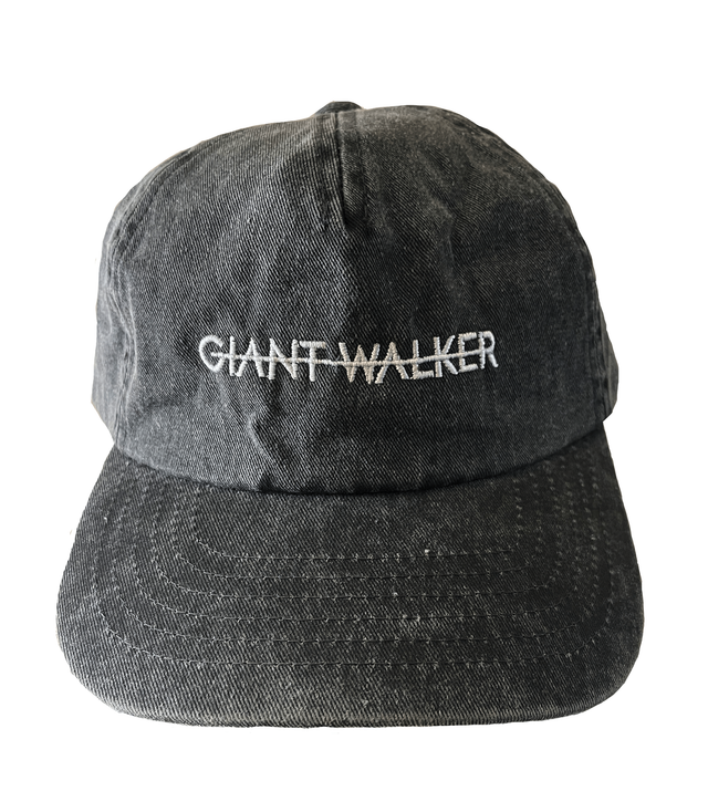 Relaxed 5-panel cap in vintage bottle green or washed black with embroidered 'Giant Walker' logo. Adjustable fit with brass buckle.